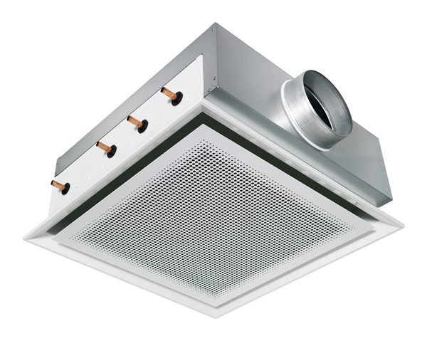 Active chilled beams, with four-way air discharge and high thermal output, for air-water systems. For installation flush with the ceiling, preferably in rooms with a height up to 4.00 m. The units consist of a casing with mounting brackets, primary air plenum, non-combustible nozzles, and horizontal heat exchanger. 5 nozzle variants for demand-dependent induction: 4 nozzles each with different opening diameters, 1 twin nozzle with adjustable opening diameters.