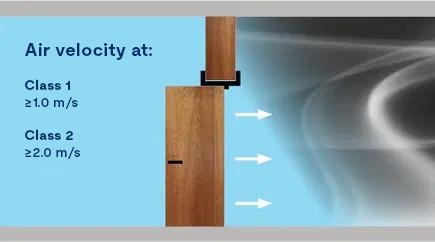 The overpressure in the stairwell also ensures that air flows through leakage areas (e.g., gaps near a door) and prevents smoke from entering the stairwell from the fire floor. It is important to ensure a permanent, sufficiently large outflow from the fire area. For the system to function safely, a flow rate of 2 m/s must be ensured in the door cross-section.
