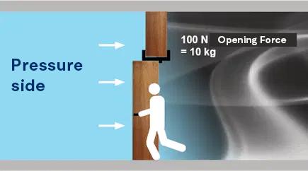 When doors to protected spaces (e.g. stairwells or lobbies) are closed, the system maintains a positive pressure differential between the protected space and the adjacent fire-affected area. This pressure differential acts as a barrier to smoke ingress, limiting leakage through door gaps and construction tolerances. Design pressures are carefully controlled to balance effective smoke exclusion with acceptable door opening forces, ensuring doors remain operable for occupants. This condition represents the steady-state phase of evacuation, where doors are predominantly closed and the system maintains protection under stable conditions.